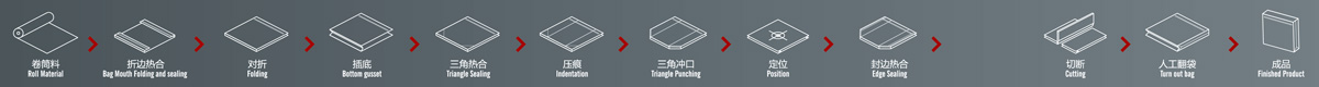 工序流程:卷筒料 折邊 穿繩 熱合 對(duì)折 插邊 定位 打孔 熱合 切斷一收集成品。